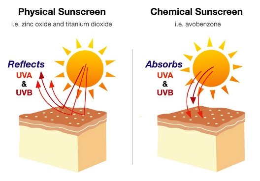 sunscreens which protects us by sitting on top of our skin and deflecting the